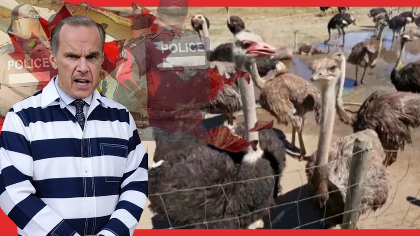 At the other end of the spectrum, the Carney government has unleashed a “task force” comprised of a reported 200 RCMP officers against an ostrich farm in Edgewood, BC. This death squad could be arriving as I write this. It is charged with capturing and killing some 399 ostriches at the Universal Ostrich Farms because some of the birds were sick last December with what may have been avian flu. The herd has enjoyed over 230 days without sickness or any evidence of any virus. That’s not good enough for the Canadian Food Inspection Agency (CFIA), where flighty pseudo-science and brutal politics determine the fate of ostriches and farmers alike.
