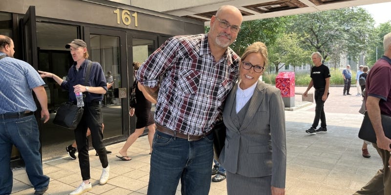So we sat there while the judge went through verdicts and sentencing from other Freedom Convoy cases, including those involved with the Coots border crossing and Pat King. Pat was in the courtroom with his lawyer. We had chatted before the judge arrived and I don’t know if Perkins-McVey was even aware that he was in the room. When she began talking about him, I pointed to Pat and he looked over at me and smiled.