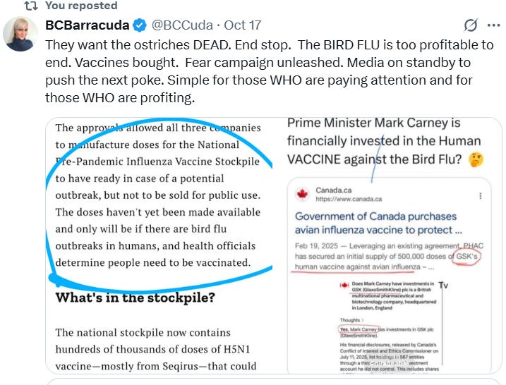 Combined with the Carney government’s obsession to censor social media, confiscate a myriad of firearms from law-abiding gun owners who are largely farmers and establish a digital ID, the tragedy at the ostrich farm is about how a country that used to respect the rule of law and democratic protocol has slid into authoritarian rule that far too few Canadians tried to stop. We know the Carney government is heavily invested in avain flu vaccines that were purchased from the UK’s GSK. Is Mark Carney personally invested?