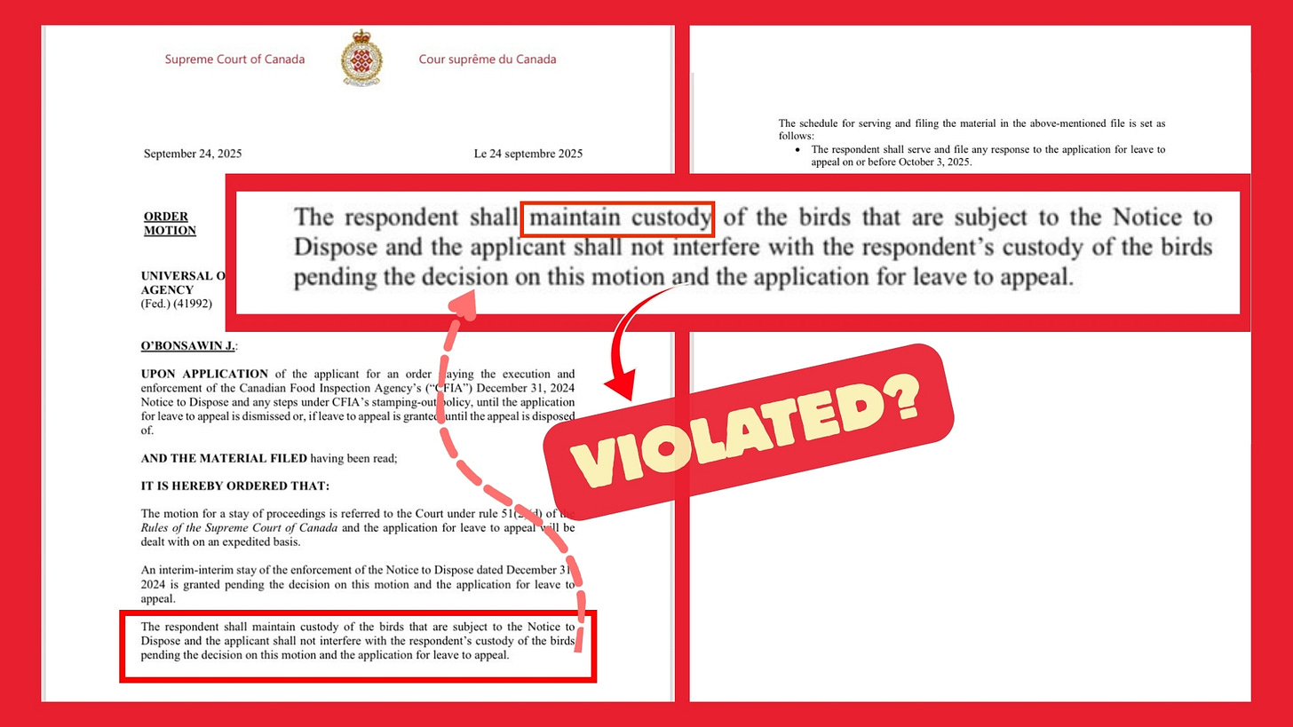 The CFIA has brazenly but systematically taken over this farm and is doing everything to impair the health and end the lives of the remaining birds.
