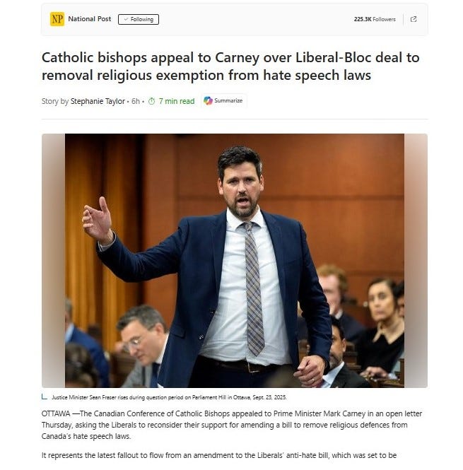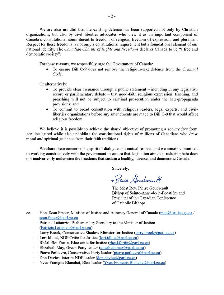 The Catholic bishops have also sent a letter to the Prime Minister objecting to the removal of the religious exemption from Bill C-9.