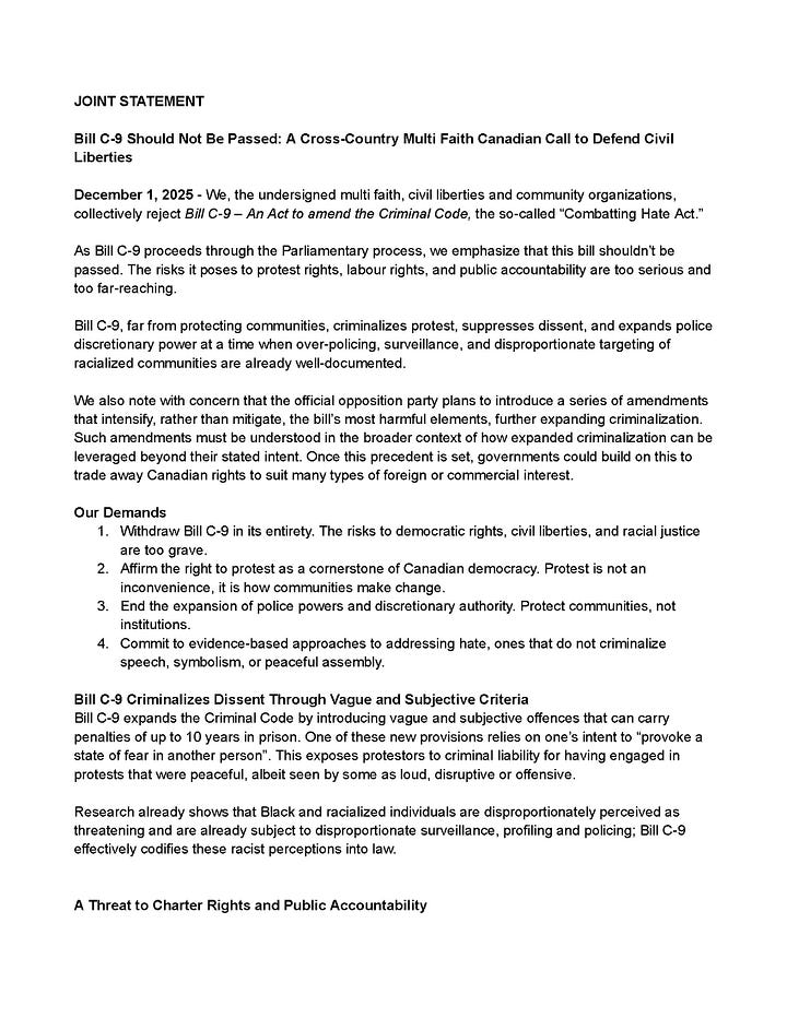 Bill C-9 was introduced in September 2025. Its passage will significantly chill Canadians’ expression. It will provide less clarity for Canadians whether or not a particular tweet, column, podcast or video runs afoul of the actual Criminal Code, with sentencing running the gamut all the way to life imprisonment.