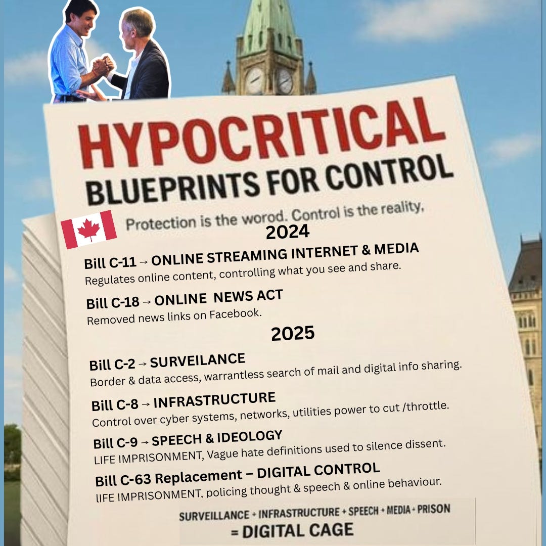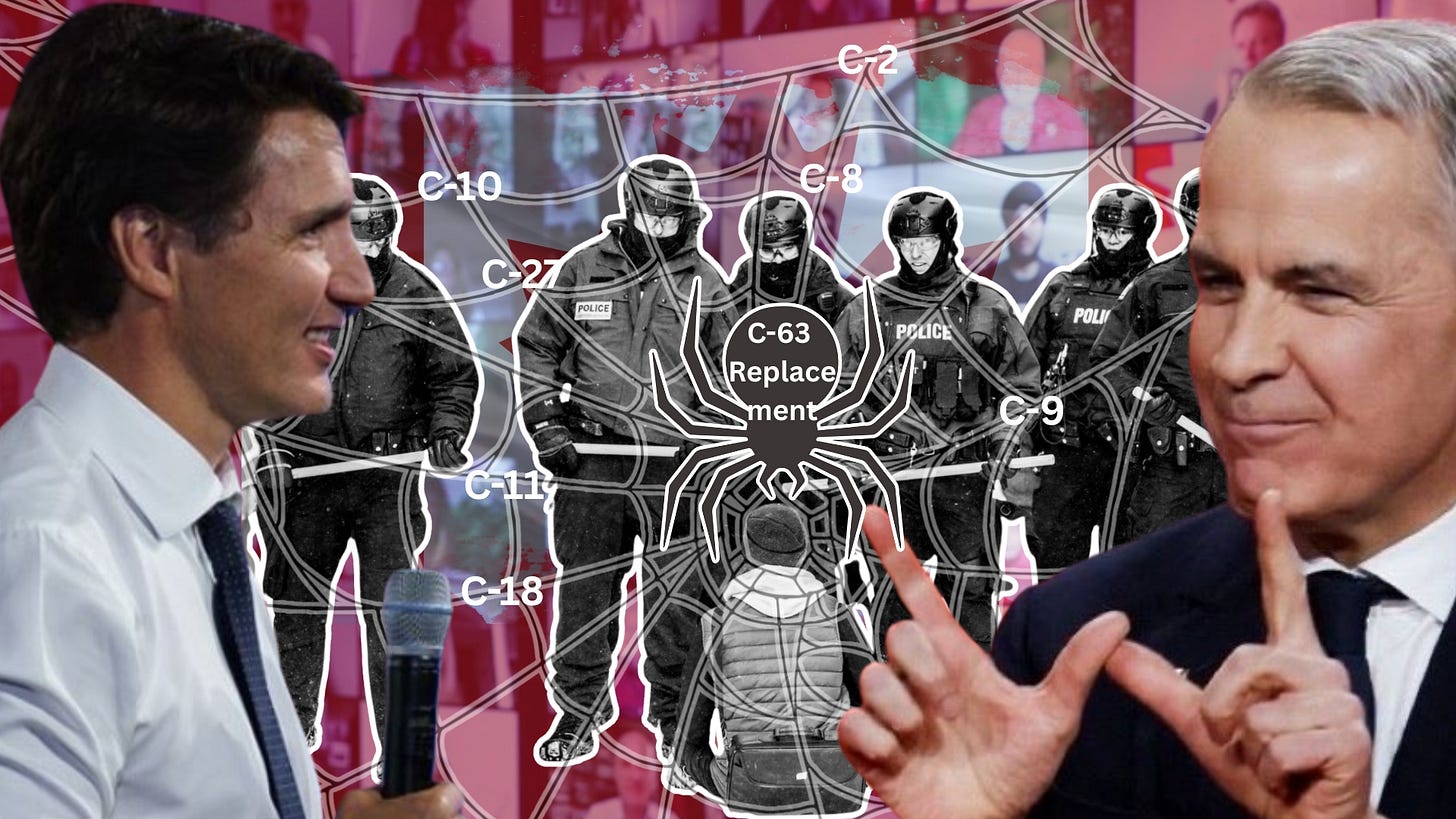 So, the Trudeau-Carney governments are laying down a spiderweb of sneaky laws with complicated jargon, all under individual bill titles, that will undoubtedly censor and surveil Canadians at the same exact level as the United Kingdom.
