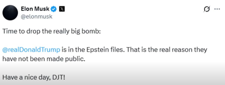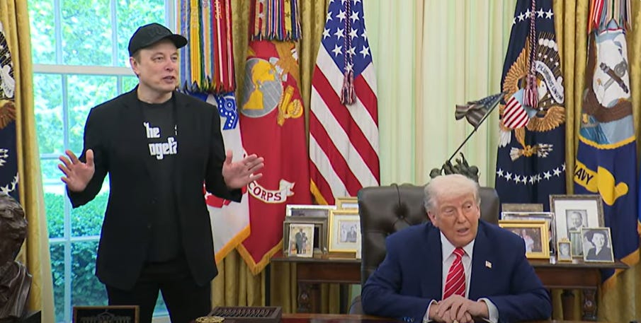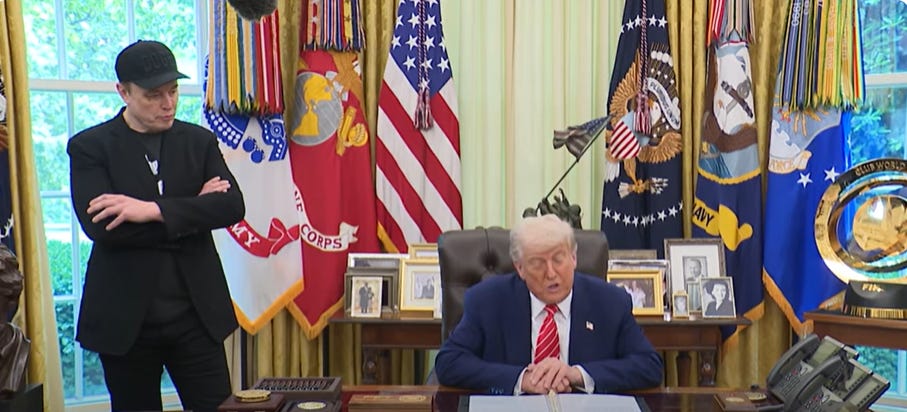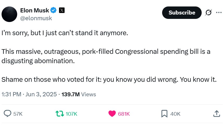 But then Musk had to watch as Trump proudly proclaimed a $1 trillion defense budget and now the “big, beautiful bill” that of course is very big but not in the least beautiful. Musk found his billions in waste and Trump continues to waste trillions. Almost as soon as Musk had attended his last cabinet meeting and delivered a hopeful prediction that DOGE would eventually succeed in securing lasting savings to the US treasury, he vented on X like a man who can no longer keep his dinner in his stomach but must throw up.