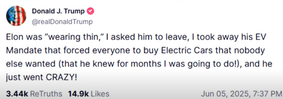 And before that Trump claimed that “Elon was ‘wearing thin,’ I asked him to leave, I took away his EV Mandate that forced everyone to buy Electric Cars that nobody else wanted (that he knew for months I was going to do!), and he just went CRAZY!”